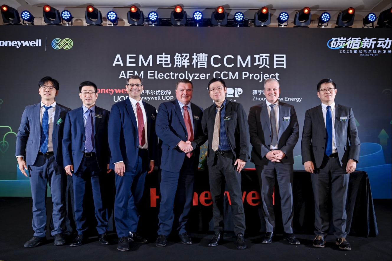 峰会上,霍尼韦尔与上海骤宇新能源有限公司在绿氢催化剂涂层膜(CCM)技术在阴离子交换膜(AEM)电解槽上的适配性相关研究达成战略合作,助力加速AEM技术生产绿氢的规模化应用。同时,霍尼韦尔还与中科一碳能源科技(大连)有限公司在可持续航空燃料领域达成战略合作,共同推进位于浙江舟山市的10万吨乙醇制可持续航空燃料项目的落地,以满足日益增长的航空市场需求。